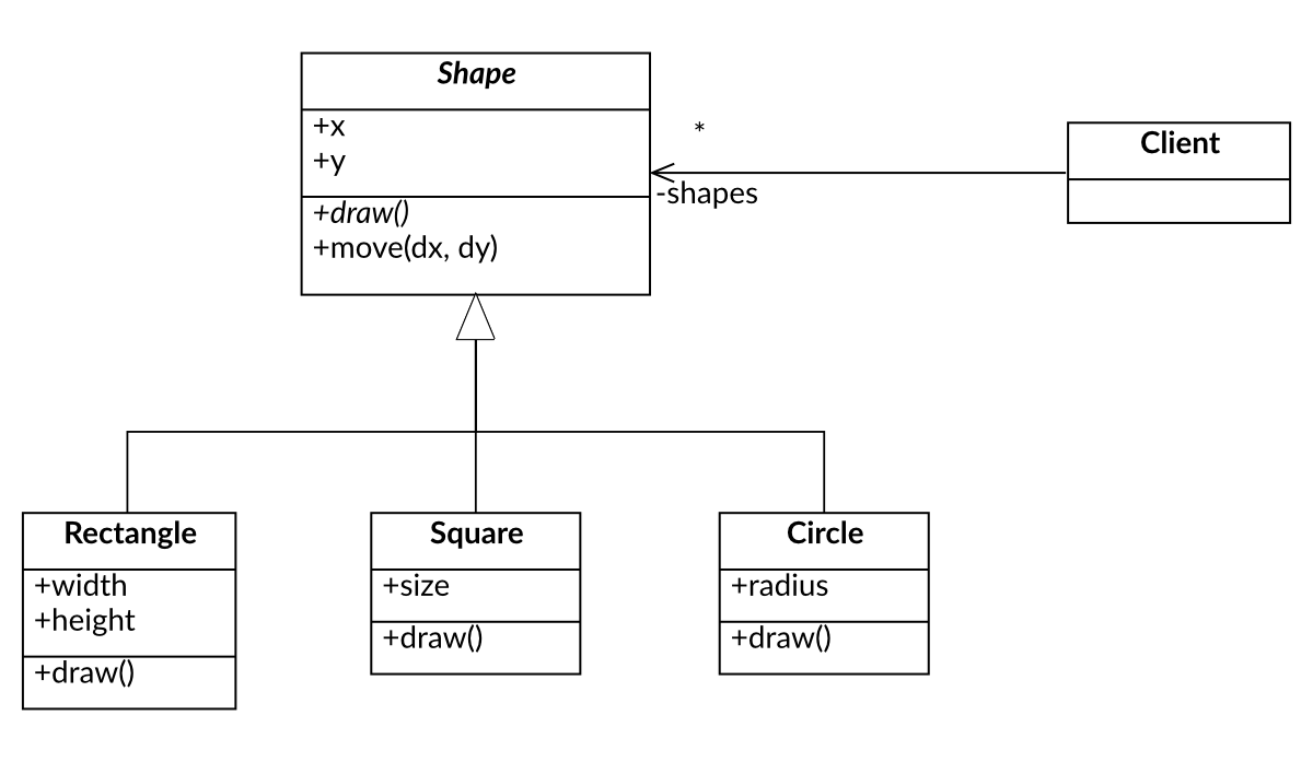 The code below shows an example of an abstract class Shape that defines an interface that contains two virtual functions move() and draw(). This abstract class has partial implementation. It has members x and y that represents coordinates. Having these coordinates one can implement the move() function. The draw() function is a pure virtual function that must be implemented by the derived classes.
