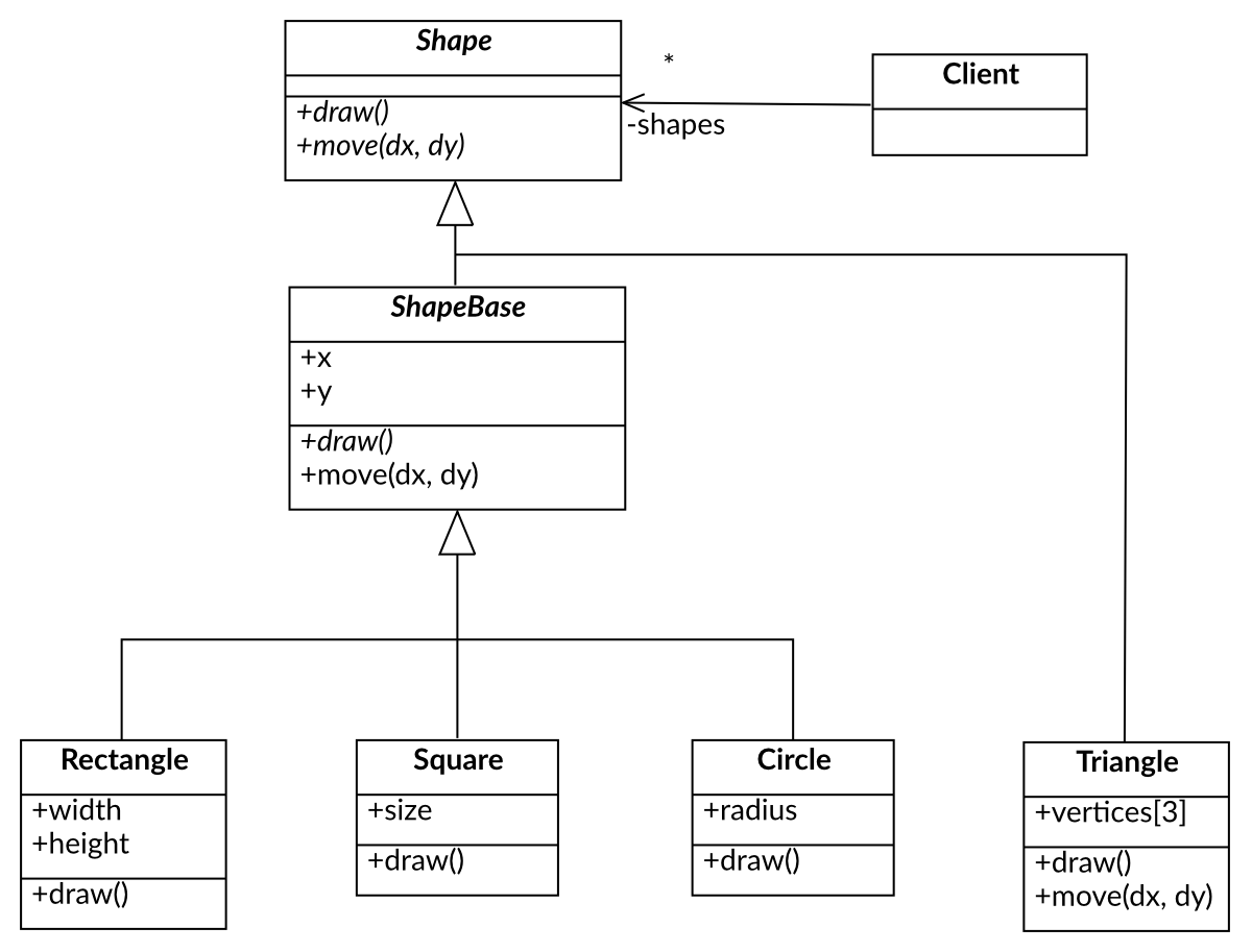 In order to avoid dependency on the base class implementation one can extract “the pure interface” - Shape. The abstract class ShapeBase with a partial implementation derives from the interface. Concrete classes can choose to derive from the interface avoiding unnecessary coupling or from the abstract class avoiding code redundancy.