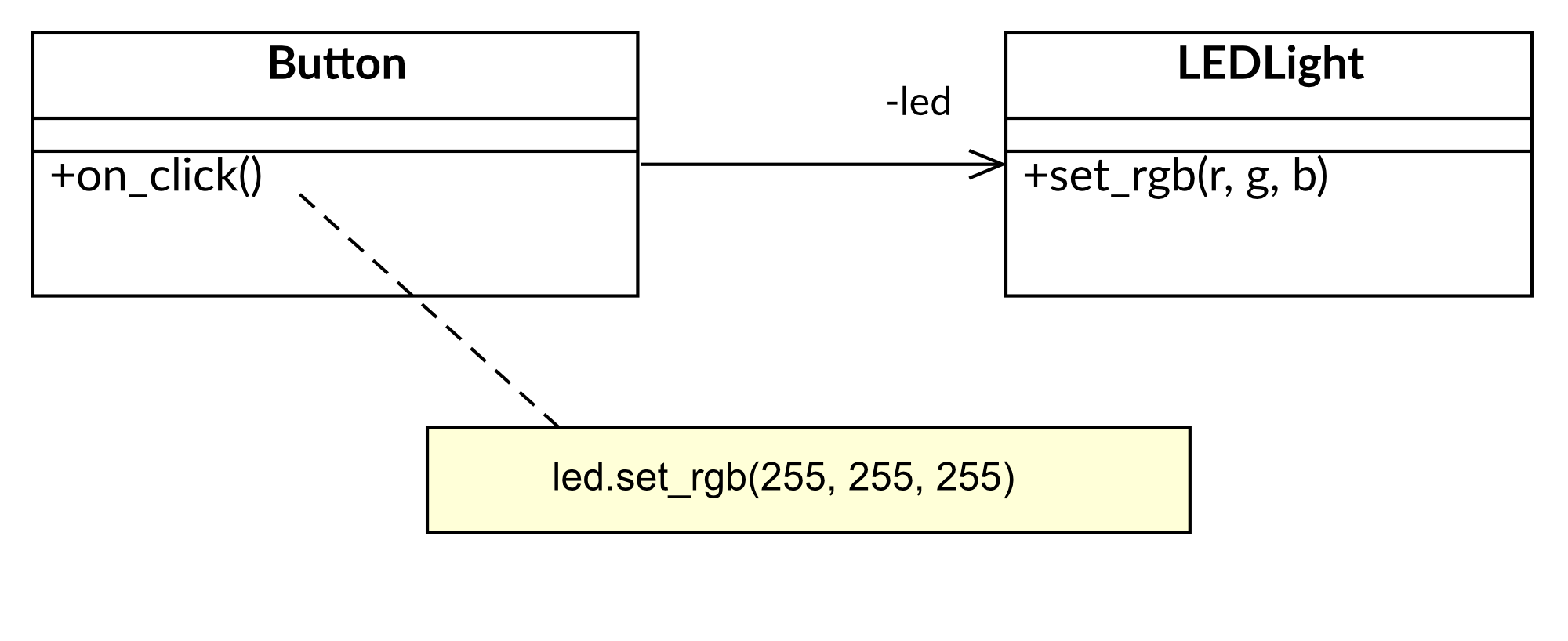 ToggleButton) depends on a low-level module (LEDLight). When we want to turn on the light we need to directly callset_rgb(255, 255, 255)method of theLEDLightclass. We push the knowledge how the low-level module works into the high-level module (we need to know what is RGB color space in order to use the LED light properly).If we are forced to use different LED light implementations, we need to modify the